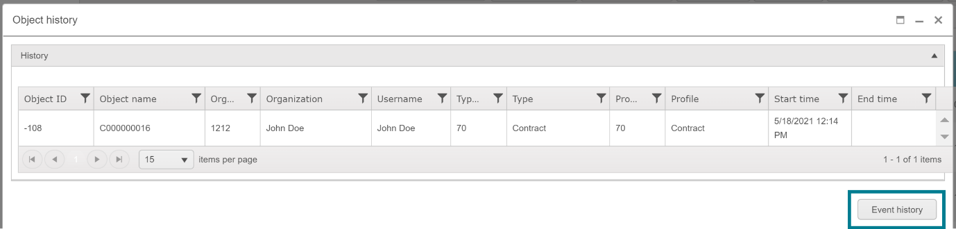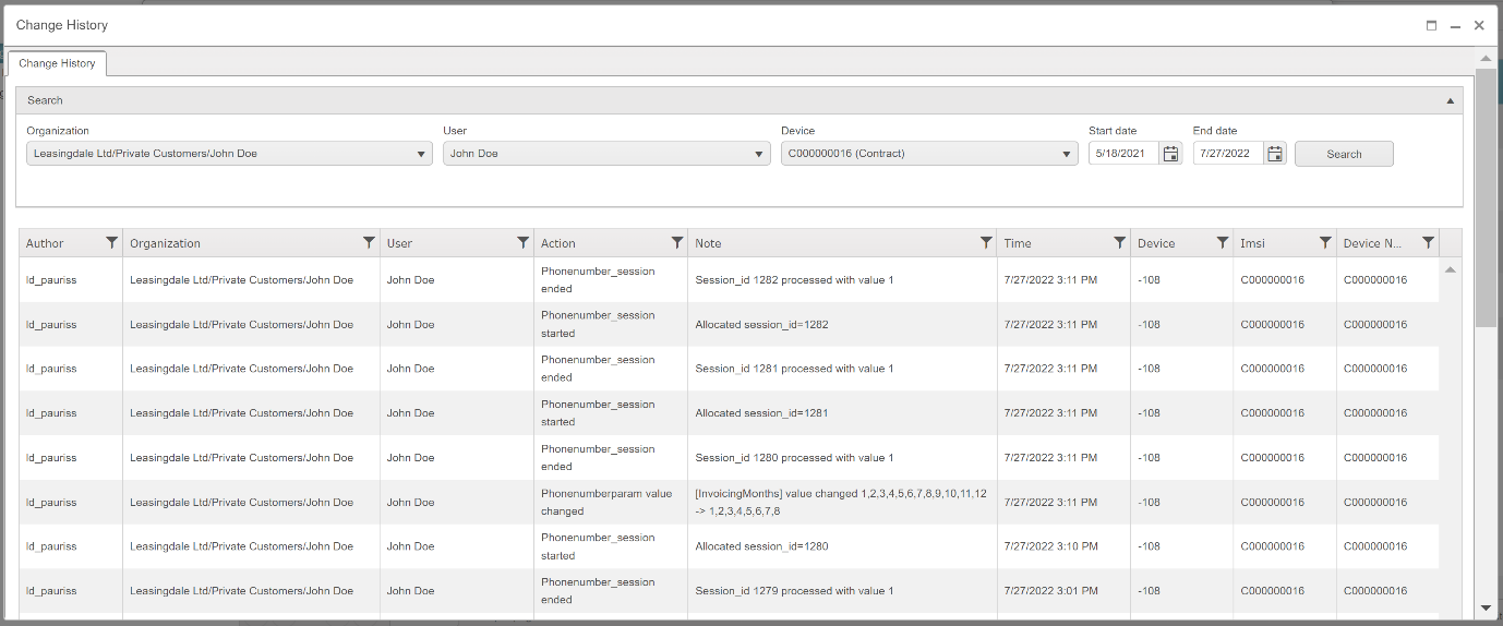 - All the modifications related to the contract can be seen in the Change History view. By using the Search function, you can search for specific modifications, e.g., related to a certain time frame.