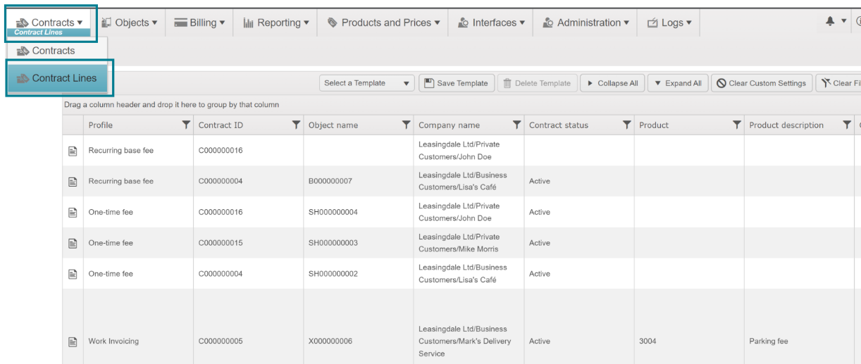 Contract lines can be seen by selecting Contracts from the top bar and then selecting contract lines from the drop-down menu (as illustrated in the figure below):