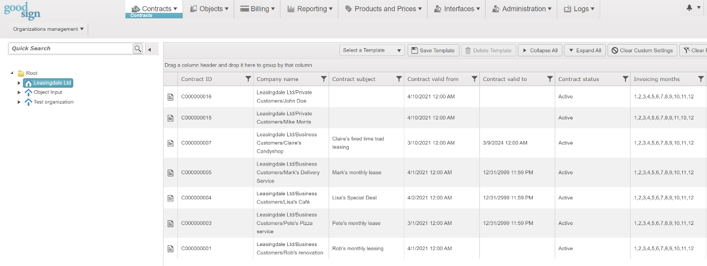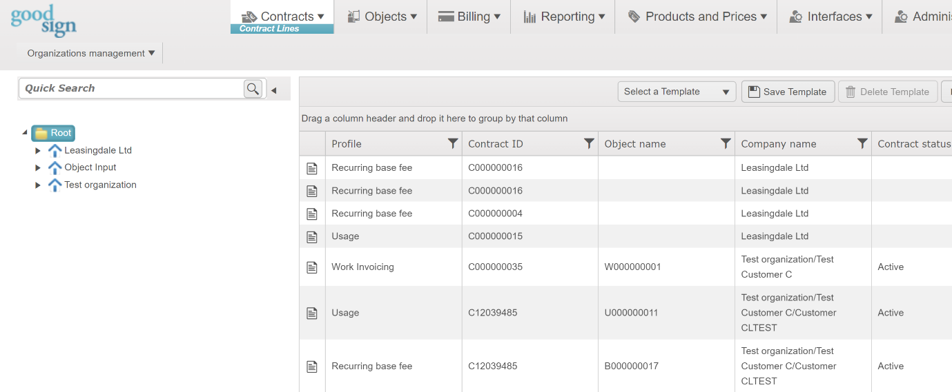 Good Sign’s Contract Module provides a hub for managing customer contracts that use standard profiles for typical billing patterns: