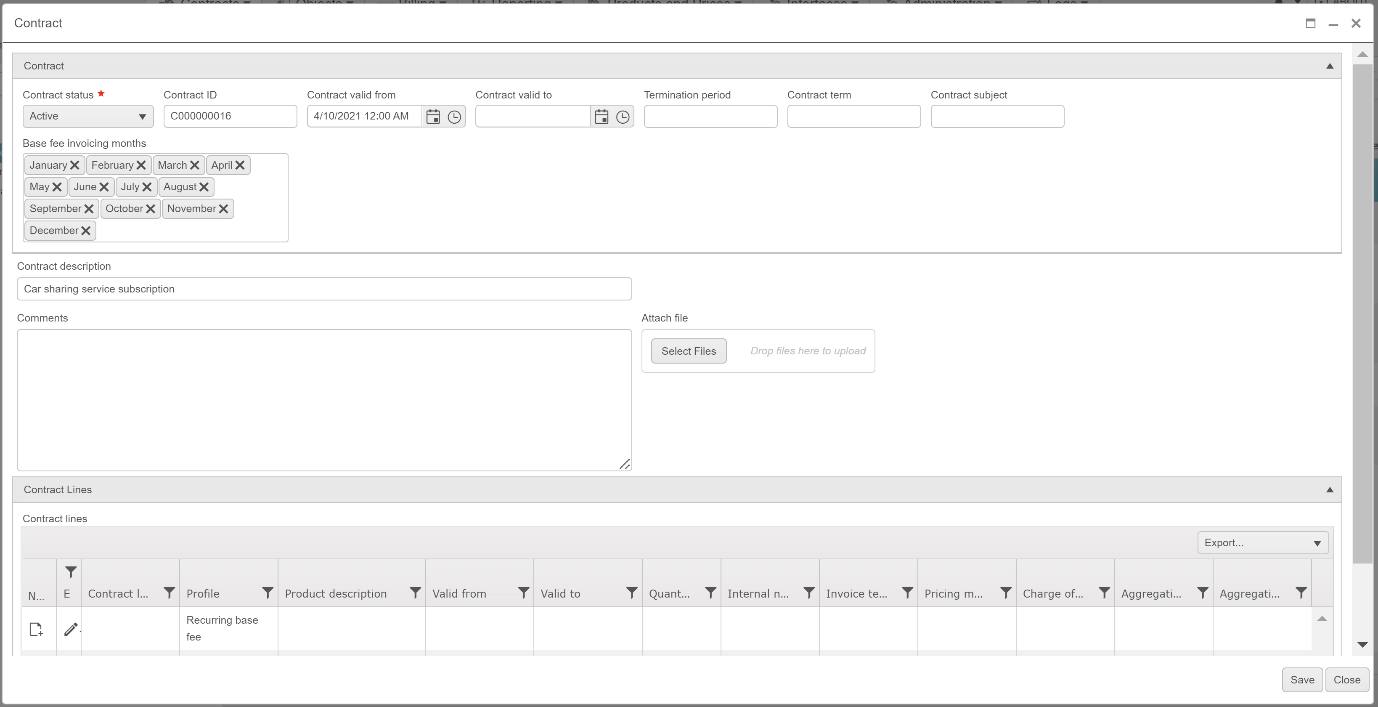 Each contract line is tied to a product and has parameters. These include: a validity period, a pricing model, billing months, and usage data aggregation controls, which together rule pricing and billing.