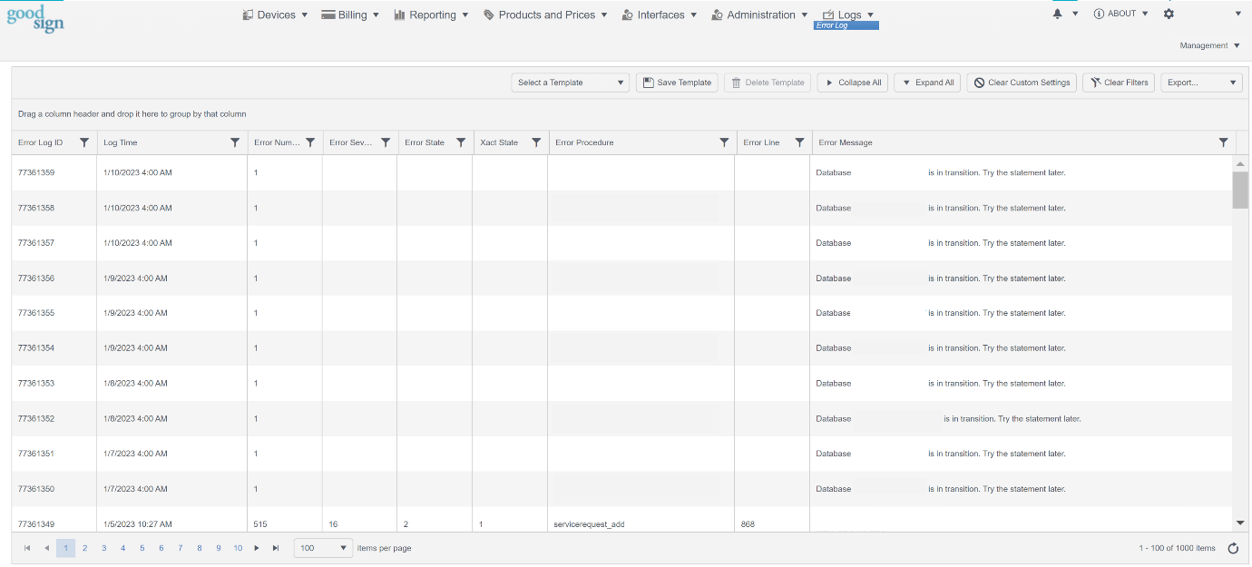 The Error Log dashboard has normal Good Sign Grid functionalities as explained in the How to Manage the Good Sign Grid guide.