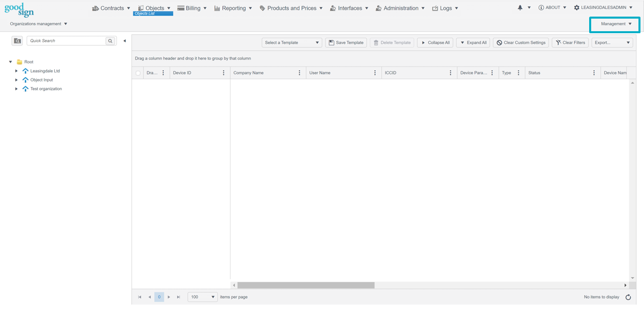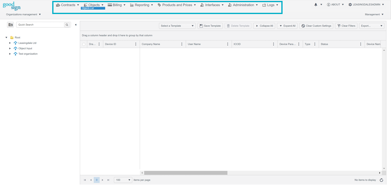 The Dashboard Menu is the main navigation menu on the top of the page. It can be used to move from dashboard to dashboard. A Dashboard is the main view that opens when clicking an item in the dashboard menu.