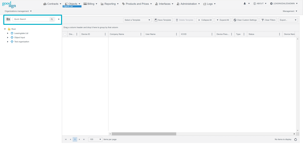 The Quick Search bar is a very useful tool to find what you need from the tree situated on the left. You can use the name of the organization/product category/table you are looking for in the search, but some other parameters can be used also, i.e., business ID. The tree differs depending on the dashboard, but the search bar works the same way regardless.