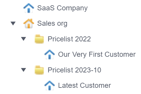 Folders are a special type of level in the Organization Tree. These levels in the Organization Tree can represent hierarchy levels that are relevant in controlling your business. They can be used, e.g., for the separation of domestic and foreign customers, or governmental and private companies. They can be used for setting up pricing, and other settings you wish to share within that Organization Tree branch.