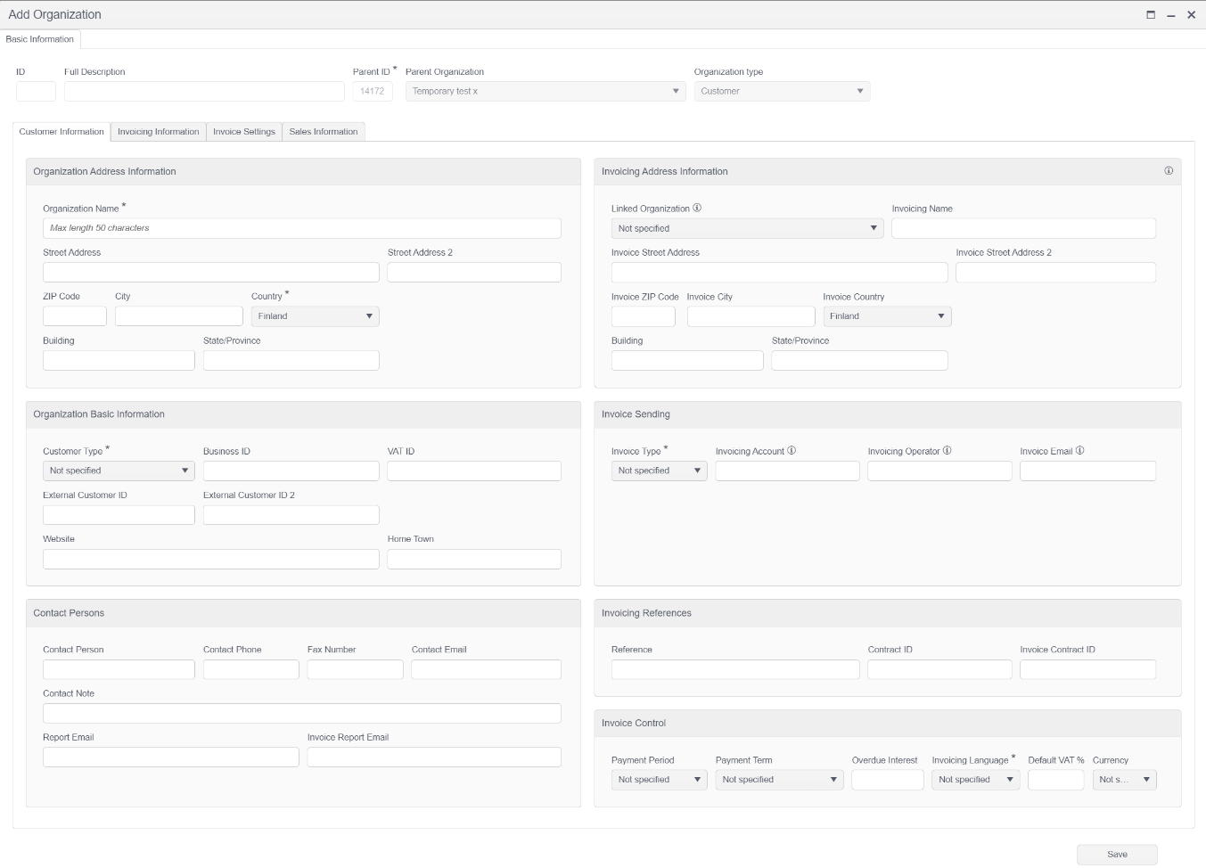 Requires user right: 2380 Organization Settings Management. In the Organization Settings tab, you can add or edit organization settings. Settings are inherited from top organization or can be set individually to the organization.