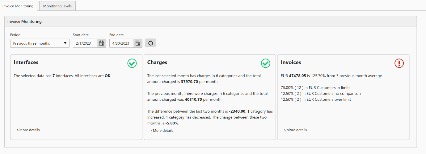 The dashboard consists of a monitoring view of three main segments: Interfaces, Charges, and Invoices. Each section provides more detailed information from More details, and Charges and Invoices can be drilled down even further.