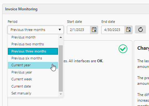 The Invoice Monitor can be used to search data by selecting one of the predefined periods or by manually selecting your own with Start date and End date fields.