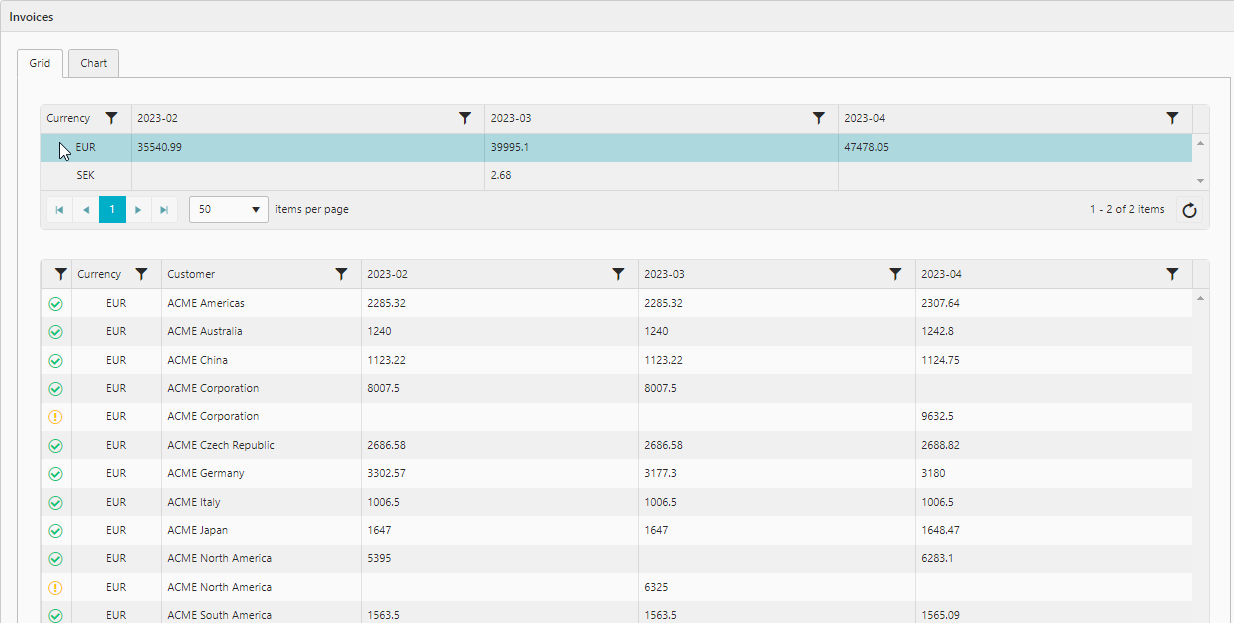 The Invoice Monitoring dashboard helps users responsible for invoicing to have a good overall view of the system status and it can help spot anomalies in interfaces, charges, and invoices. This view helps to identify situations, where something is out of the ordinary in a simple, color-coded way.