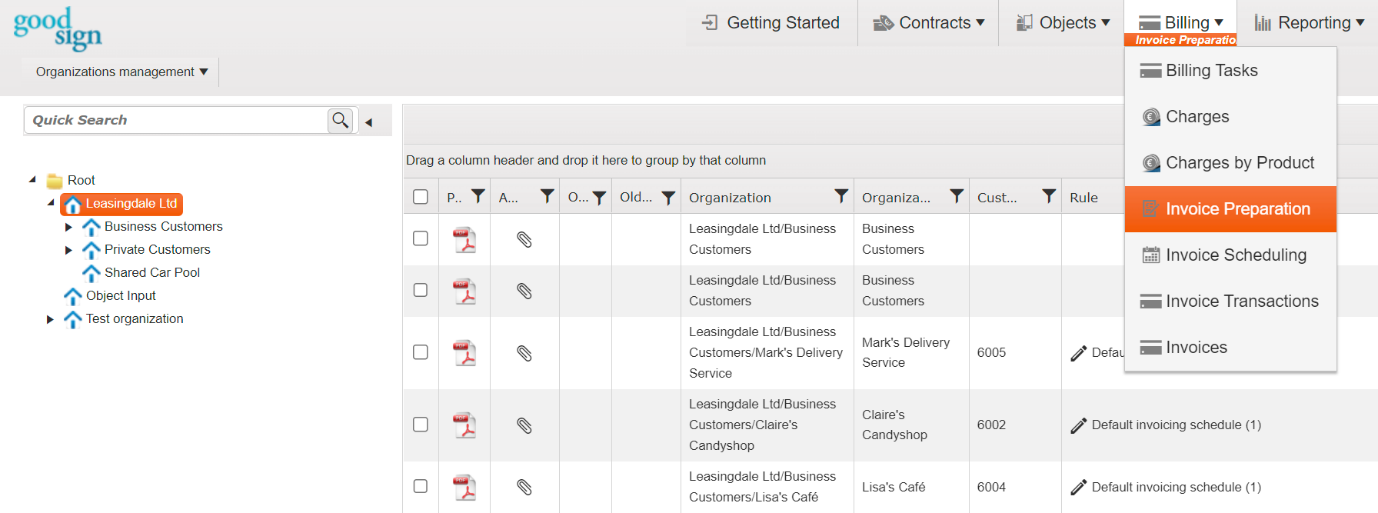 The invoices are organized by organization in the Organization Tree, seen on the left. Once you’ve chosen the right level in the Organization Tree, you can choose an invoice. By clicking on the pen in the Rule section of an invoice, you can open Invoice Scheduling. There you can view the schedule that generated the particular invoice. This is mostly informative and should be edited with caution. We will discuss invoicing scheduling in detail in another user guide.