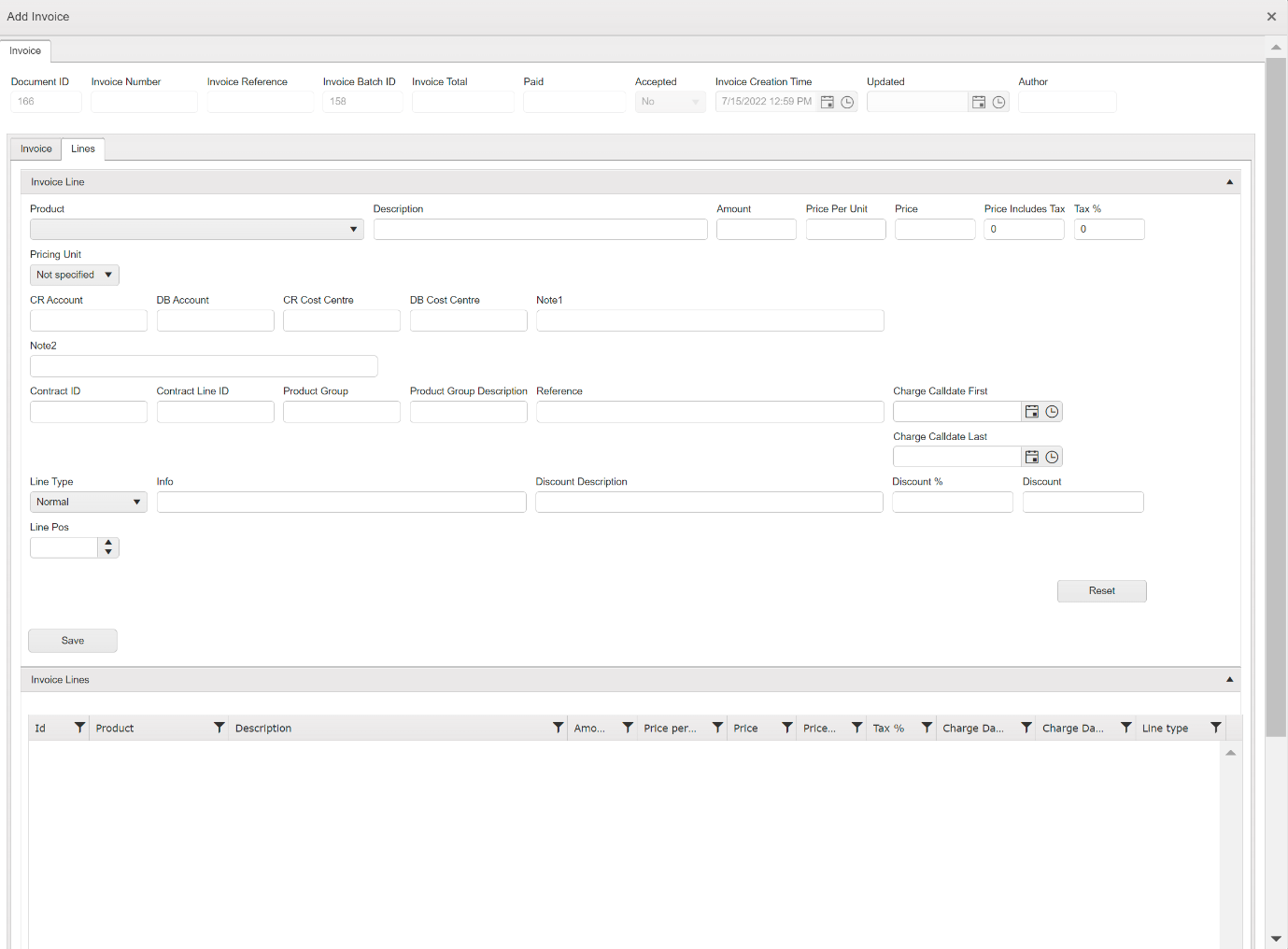 - The Lines tab appears, where you can add the invoice lines manually to the invoice