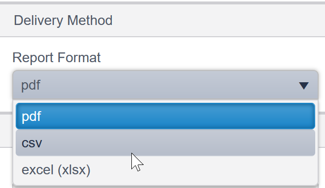 Under Delivery Method you can define the Report Format. The options are pdf, csv or excel (xlsx).