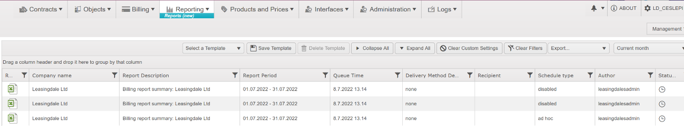 The main view shows all the reports (from the activated/selected organization level) that have been run, no matter who has run the report or whether it is a one-time or, i.e., monthly report. Before any reports have been run the grid is empty.