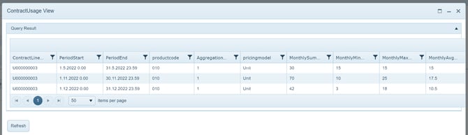 - Year – Usage data is aggregated yearly. All transactions within a year are summed, and from a charging perspective. A contract line has a yearly maximum quantity of X and when the aggregated sum exceeds this, the charges of the extended part will be inserted to monthly invoices