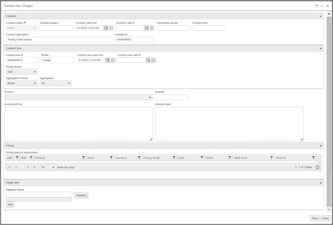 Note! After the required fields have been filled, an automatic charge will be made with the scheduled billing task runs, typically every morning. A charge is generated given that the contract, contract line and price are valid at the time, and valid transaction data is received against the contract line. By default, usage charges are not generated before the 3rd day of the month, to allow time for receiving the transactions from previous months.